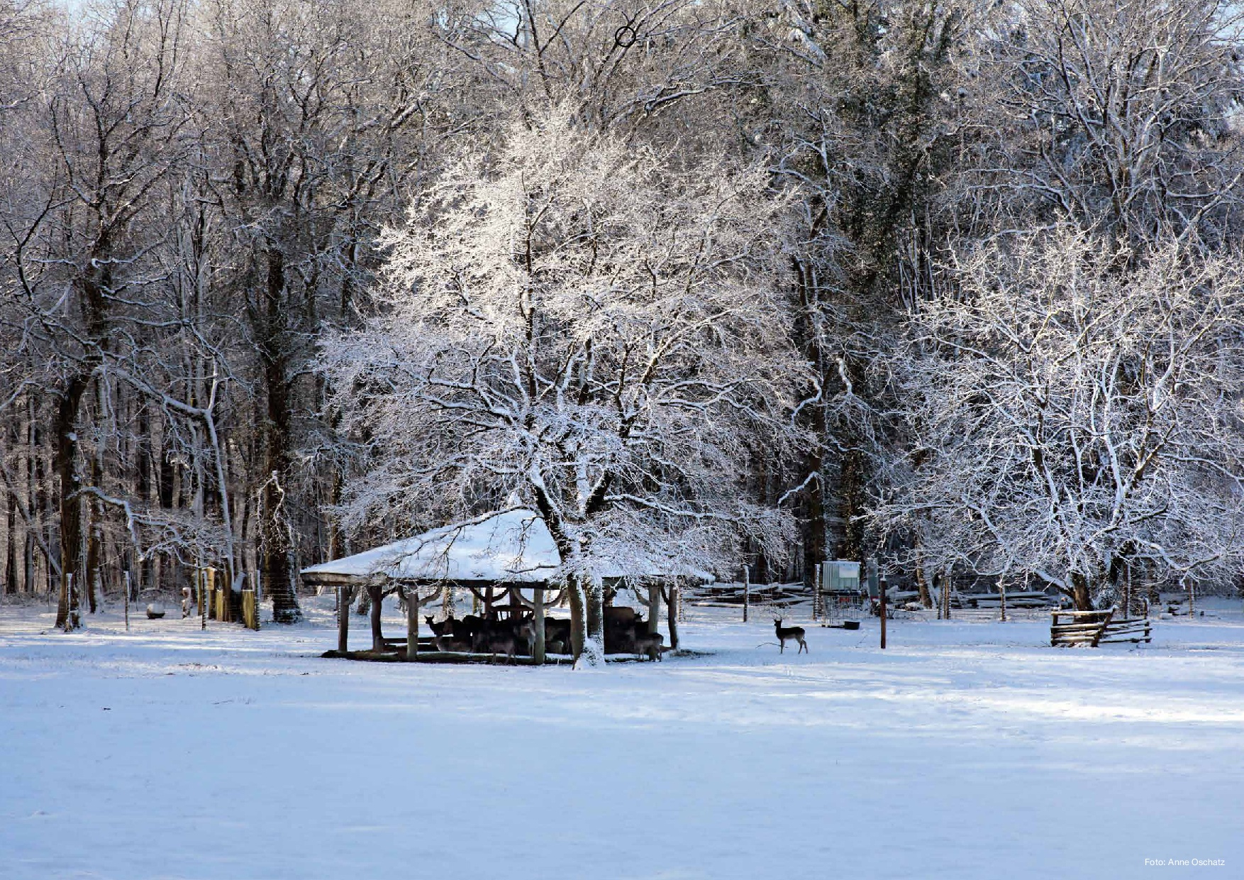 So schön kann er sein – ein Wintermorgen im Niendorfer Gehege: Sonne,  schneebedeckter Grund und pudrig beschneite Bäume. Ein Damwildrudel hat im Unterstand des Wildgeheges Schutz gesucht. Wer genau hinsieht, erkennt davor noch zwei Hirschkühe, die wohl auch hineinschlüpfen wollen. Das Tier  weiter rechts außen hat vielleicht etwas anderes im Blick.