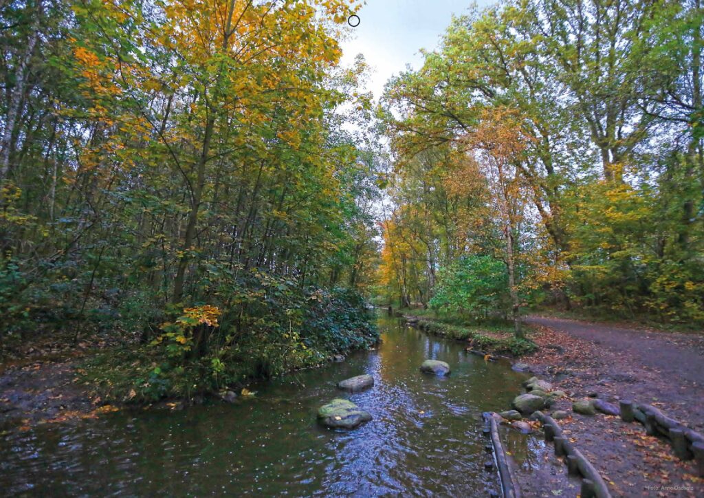 Die Kollau im Herbstlaub: Die Renaturierung ist in diesem Abschnitt am südlichen Ende des Niendorfer Geheges unweit der Güterumgehungsbahn bereits wunderbar gelungen und erfreut Mensch und Natur. Mit der Neumodellierung des Flusslaufs 2021, bei der Strömungslenker aus Kies und fest verankertem Totholz eingebaut wurden, konnten wieder vielfältige Lebensräume geschaffen werden.